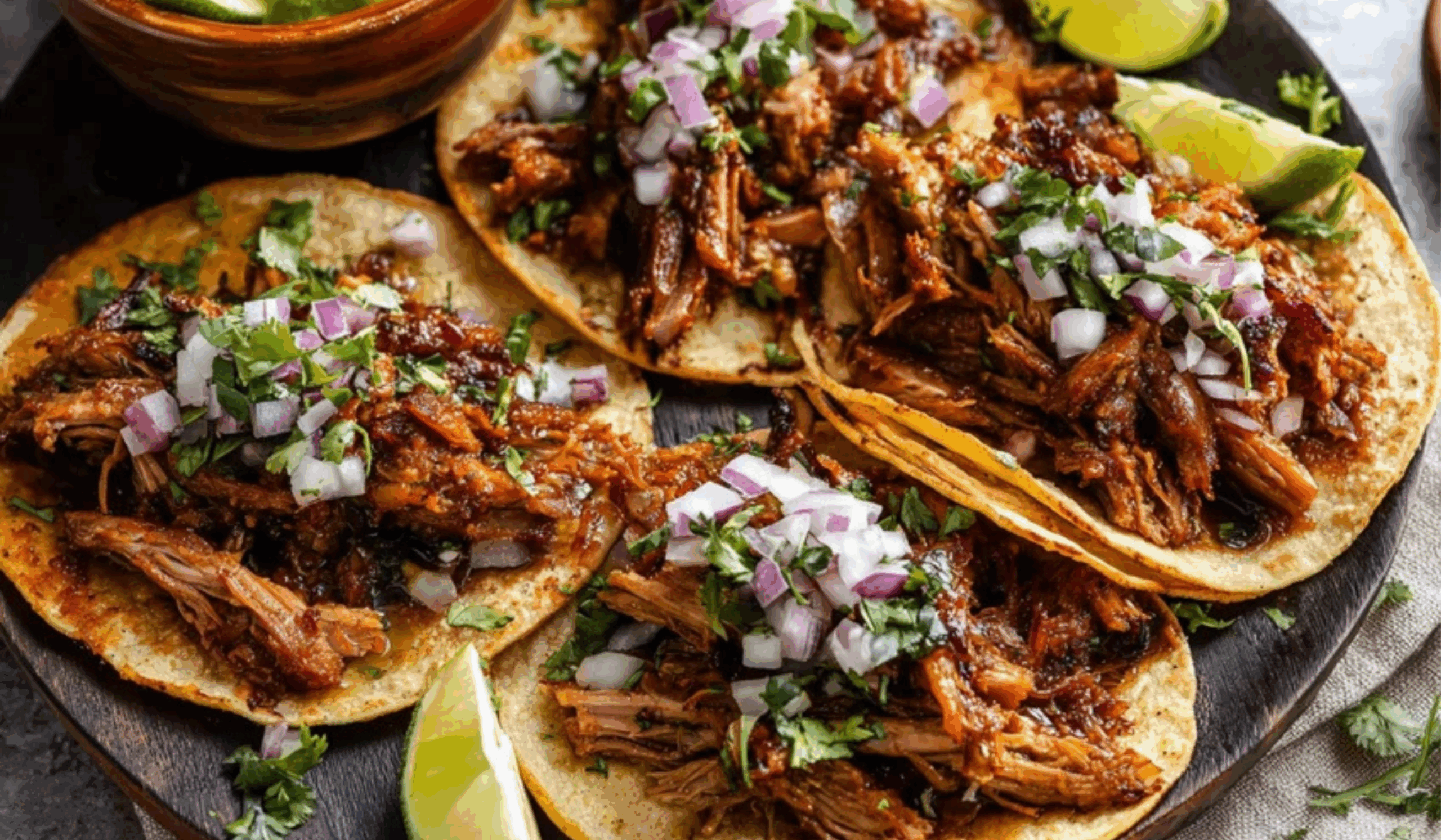 - Fill warm tortillas with beef carnitas, diced onions, cilantro, and a squeeze of lime.