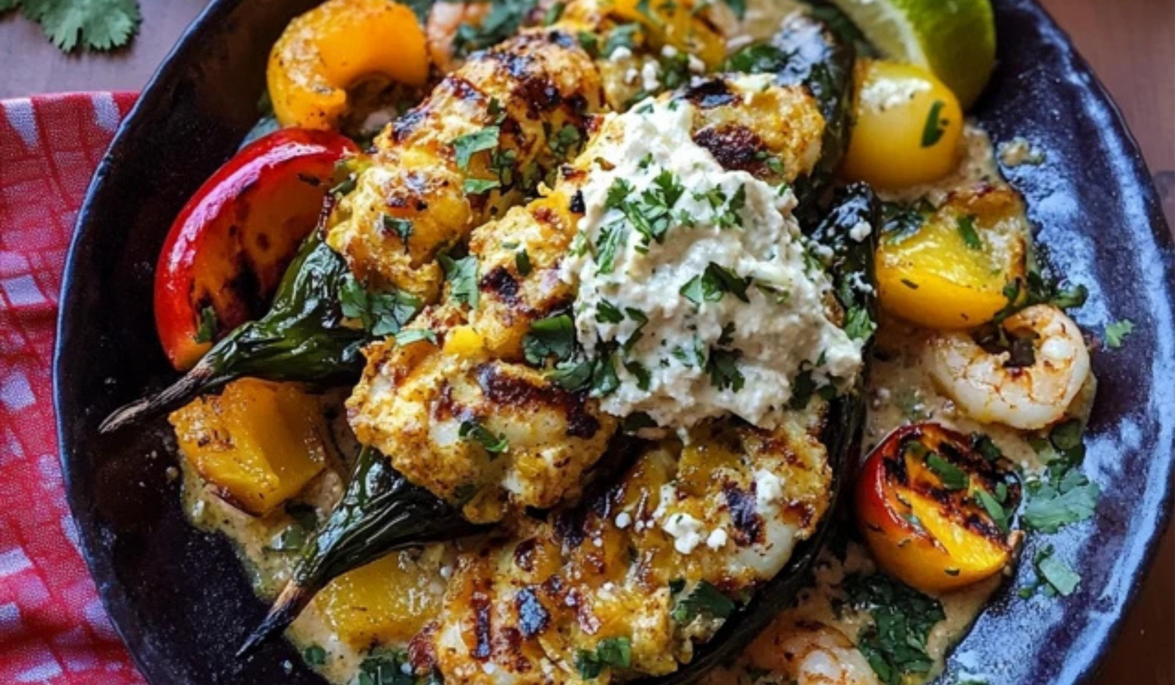 🔥 Smoky, sweet, and bursting with flavor! These grilled chiles rellenos are stuffed with chipotle mango-peach mojo shrimp for a spicy-sweet combo that sizzles. A vibrant twist on a Mexican classic you won’t forget! 🌶️🦐🥭